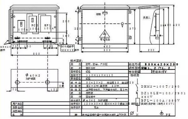 (5)照明开关箱内设KDM1—T/2(20-40A)断路器,配置DZ15L—20-40/290漏电断路器,PE线螺栓为3个。